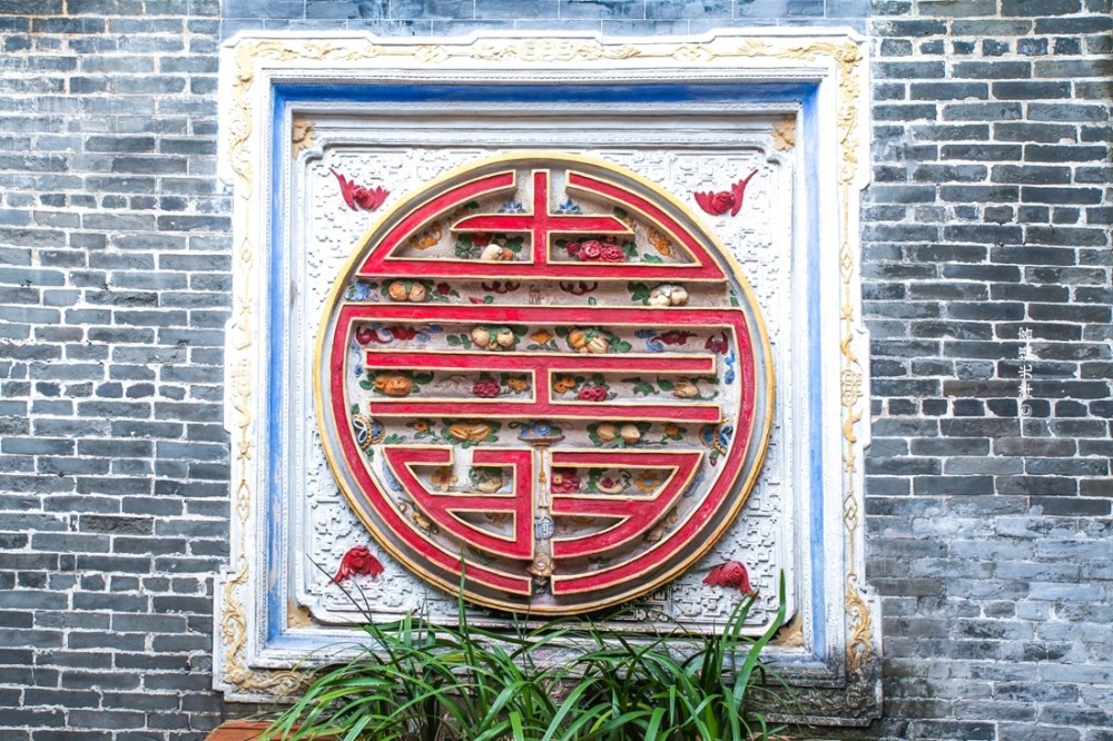 灰塑作为广东省广州地区的一种传统雕塑艺术,自然能在园林中一睹其身影。在入口照壁,一幅《四福捧寿》的灰塑赫然出现在眼前,在喜庆的红色“寿”字里镶嵌着荔枝、龙眼、木瓜、番石榴、杨桃等特色岭南佳果,四周为“四福(蝠)”围绕,寓意福寿连连。在园林其他角落也能看到多处百年前的灰塑作品。